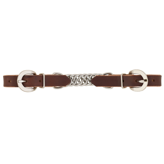 Constructed from rich brown premium English bridle leather for a smooth and refined feel, this 5/8" curb strap features a 3-1/2" flat link chain. Non-rust stainless steel hardware.