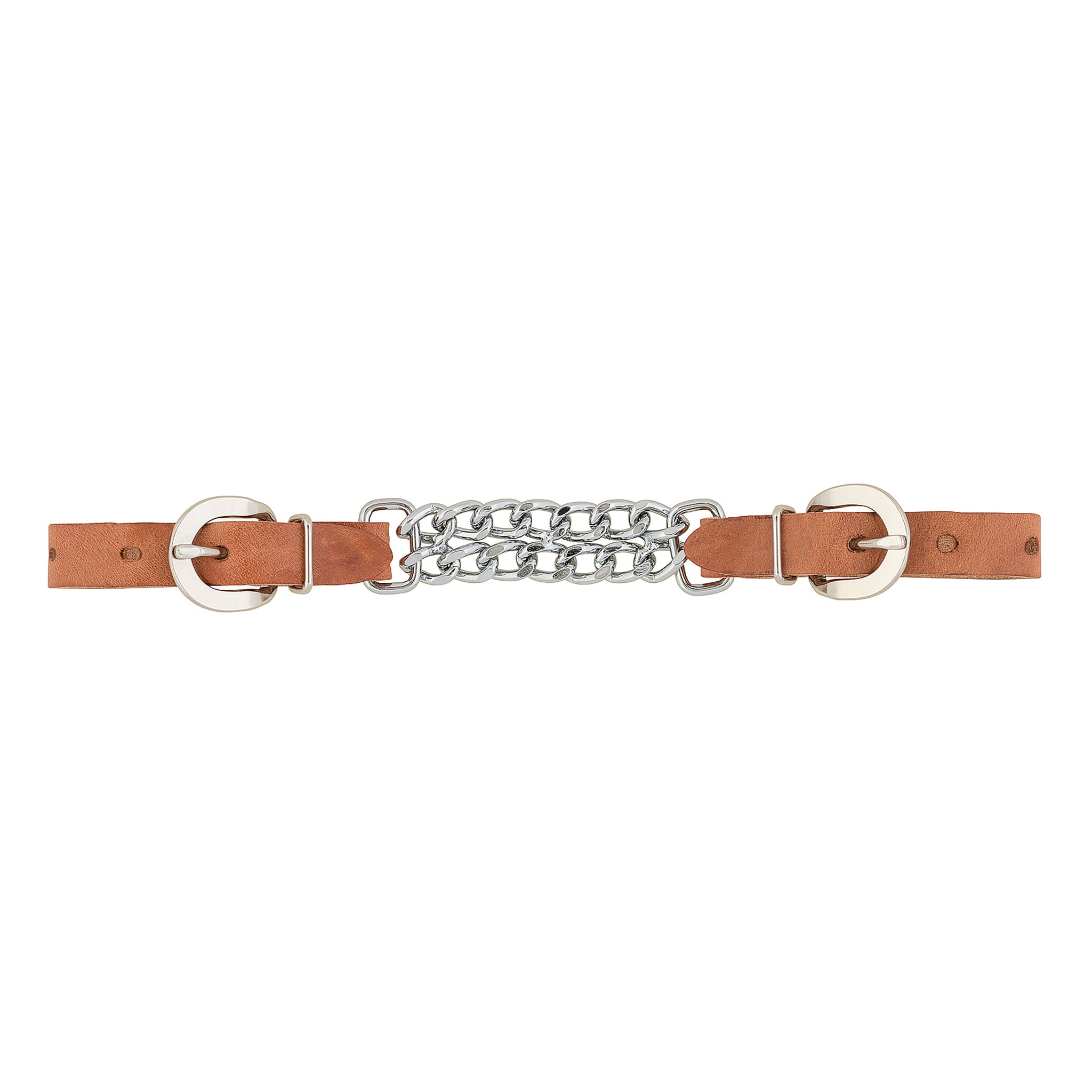 Crafted from durable, weather resistant russet harness leather, this 5/8" curb strap features two rows of 3-1/2" flat link chain for more contact. Chrome plated chains and durable nickel plated buckles.