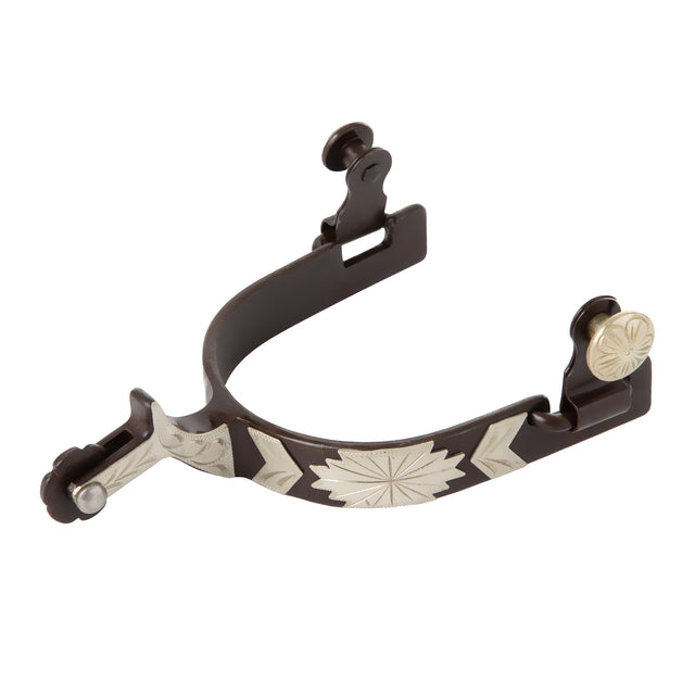 These antiqued spurs have a 1-1/4" shank, a 5/8" band and a rosebud rowel. Engraved German silver trim adds a special touch. Mens size.
