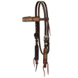 - Dark-oiled leather horse headstall with details like intricate floral carving and basketweave tooling for western flair
